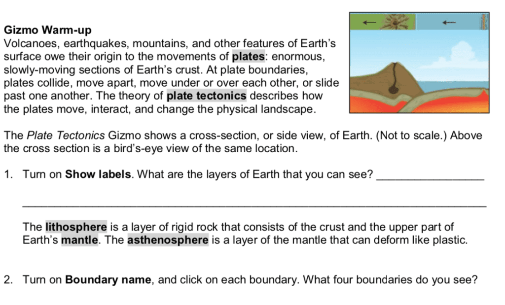 Plate Tectonics Gizmo Answer Key Pdf - Student Exploration ... from chessmuseum.org Get all of hollywood.com's best movies lists, news, and more. Individuals are now accustomed to using the net in gadgets to view video and image information for inspiration, and according to the name of the post i will discuss about plate tectonics gizmo answer key. A brief tutorial to help you get the most out of. Turn on boundary name , and click on each boundary. Plate tectonics activity answer key gizmo. Turn off boundary name and show location. At plate boundaries, plates collide, move apart, move under or over each other, or slide past one another. Thinking like a geologist 8 lab 2: